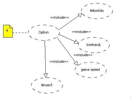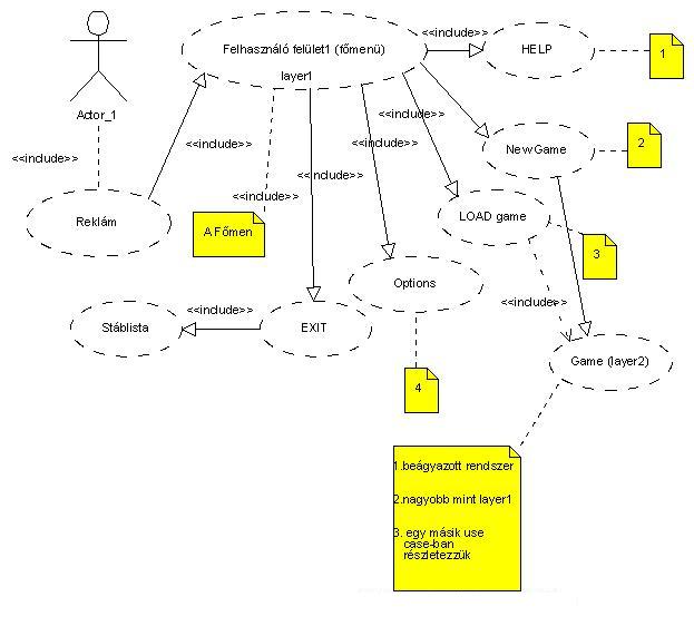 A diagrammon lévő Aktor_2 a felhasználó : Egy ilyen kontextusban a felhasználó (játékos, játékokra jellemző kontextus) csak szolgáltatást kap a programtól és minimális kényelmi beállításokat változtathat a rendszeren. A diagrammon szereplő use case-ek: Reklám: A program indítása után közvetlenül megjelenik(mozifilm szerűen) a készítő csapat neve, készítés dátum és a programozók nevének listája. [ Keypressed esemény hatására átugródik ] Felhasználó felület1(főmenü): A kezdő vagy kiindulásipont.A használható szolgáltatásokat mutatja mindig. Help:Megmutatja kisebb példák segítségével hogyan kell a programot használni. A helpfile-ok a html(célja: interneten utólagosan is bővíthető)szabványt követik, így akár külső böngészővel is megtekinthetők. Keresés: Képes egy kulcsszóra keresni a htmlfile-okban. Oldalanként:A helpet ömlesztve kidobja a képernyőre, melyben a cursorral mozoghatunk. Tárgymutató:A htmlfileok tartalomjegyzékében böngészhetünk. Ha kiválasztottuk a megfelelőt, duplán rá "click"-elve bejön a hozzá tartozó html oldal. NewGame:Új játék elkezdése. Mission: Előre megírt missziókat kell teljesítenünk meghatározott időrendi és nehézségi sorrendben. Generated:Egy intelligens pálya generátor modul készít a felhasználónak egy véletlenszerű missziót. Load Game: A mentett játék állások visszatöltése. Betölt: Egy adott listából (Saved jegyzékben található .sav kiterjesztésű fileok) választhatjuk ki a cursor billentyűk segítségével(enter-t nyomva rá ) a visszatöltendő mentést. Mentés törlése: Maga a program lehetőséget ad a fölösleges mentések törlésére.(Enter helyett Del gomb lenyomása) Option:Főként kényelmi beállítások. / Amelyek inimális hatással lehetnek a játék teljesítményére/ Felbontás: A képernyő felbontás beállítása. A játéktér növelhető vagy csökkenthető diszkrét értékekkel.(pl: 480x640 600x800 1024x768) Kontraszt: A képélesség változtatható egy százalékos skálán. Game speed: A játék sebessége állítható egy százalékos skálán.(a gépi válaszidő csökkentés vagy növelése) Fényerő: A kép fényerőssége változtatható egy százalékos skálán. Exit: A programból való kilépéshez az exit menüpontot kell kiválasztani vagy az Esc billentyűt megnyomni. Stáblista: A program bezárása esetén egy rövid pillanatra (2-3mp) felvillan egy lista, amin a készítők, a cég neve és a szponzorok találhatók. Prekondociók: Az illető játék csak akkor futtatható, ha mind a hardware és software csomagok megfelelően működnek. Postkondiciók: A menü használata Szokásos működés(Main Flow): A menü használata. A menü elemekre kittintgatva választhatjuk ki az igényelt szolgáltatást. Alternatív esetek (Alternativ Flows):A menüben nincsenek alternatív esetek implementálva. Kivételes esetek (Exeption Flows):A menüben nincsenek kivételes esetek implementálva. (nincs rá szükség, mert nincs file írás) 3.2 Felhasználói Use Case diagramm [Layer2]: