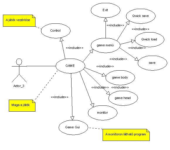 A diagrammon lévő Aktor_2 a felhasználó: Egy ilyen kontextusban a felhasználó (játékos ,játékokra jellemző kontextus) csak szolgáltatást kap a programtól. A diagrammon szereplő use case-ek: Game: Maga a játék felület, ami előtt a felhasználó idejének nagy részét tölti. Control: A program egérrel és billentyűzettel irányítható. (egérrel a játéktérben dolgozunk, billentyűzettel a játékteret mozgathatjuk) Gamemenü: Exit: Visszatérés a főmenübe. Qwick save: Játék állás mentése. (külön névmegadás nélkül) Qwick load: Játék állás betöltés. (külön névmegadás nélkül) Save: Játék állás mentése. (külön névmegadással) Game body: Game head: Információs panel a képernyő felső sávjában. A megszerzett pontjainkat írja ki a felső sorban. Monitor: M billentyűvel hívható elő. Részletesebb statisztikákat hoz a felhasználó elé. Game Gui: Maga a képernyőn látható 2.5D-s játéktér. (fekete térben egy elforgatott sík) Prekondociók: Az illető játék csak akkor futtatható, ha mind a hardware és software csomagok megfelelően működnek. Postkondiciók: A játék használata Szokásos működés(Main Flow): Alternatív esetek (Alternativ Flows): Kivételes esetek (Exeption Flows): Hirtelen fagyás és áramszünet esetén. ===> Időközönkénti mentés szükséges. (a felhasználó nem látja automatikusan történik)